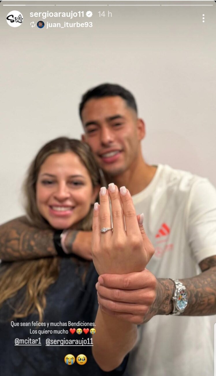 «Que sean felices y muchas bendiciones. Los quiero mucho», escribió Juan Manuel junto a una foto en la que aparece Sergio Araújo con su hermana Carmen, abrazados y mostrando el anillo de compromiso.