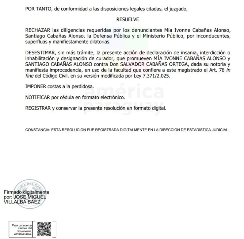 El juez en lo Civil y Comercial de Asunción, José Villalba, desestimó la demanda de insania que se había presentado contra el exfutbolista de la Selección Paraguaya, Salvador Cabañas, quien fue demandado por sus dos únicos hijos que buscaban que se le declare incapaz de administrar sus bienes.