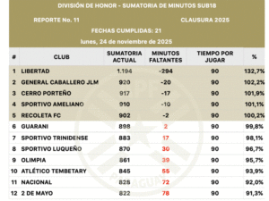 En lo que respecta a los contendientes por el título del Clausura, Cerro Porteño ya superó la barrera por 17′ y a Guaraní tan solo le faltan 2′ más para cumplir con la imposición.