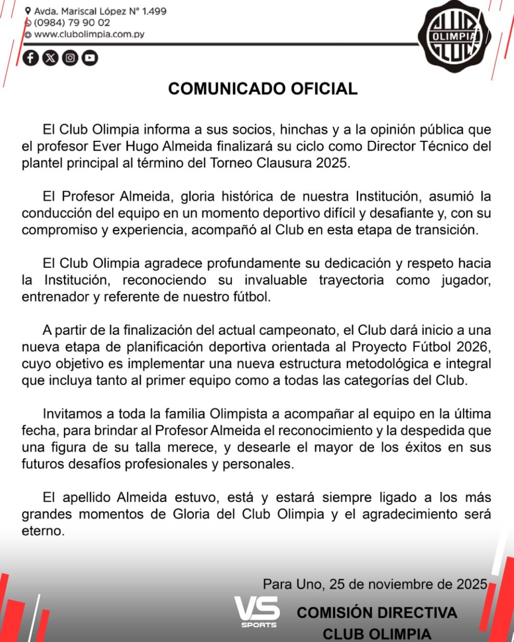 — Club Olimpia (@elClubOlimpia) November 25, 2025