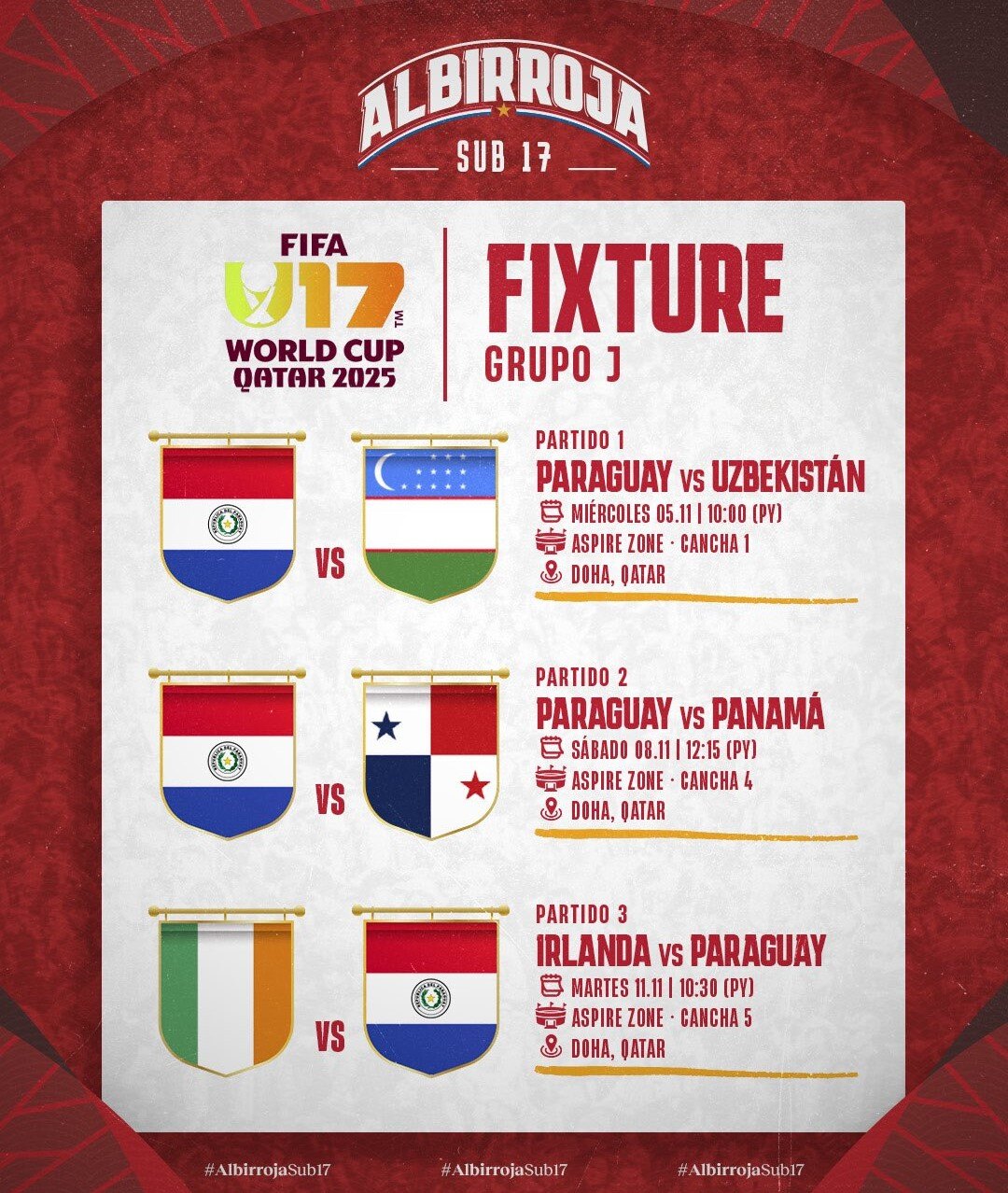 Se cierra el grupo el 11 de noviembre desde las 09:30. Paraguay jugará sus partidos en el lujoso complejo Aspire Zone de Doha, que cuenta con varias canchas de primer nivel.