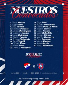 Por su lado, no figuran Alan Soñora y Juan Iturbe, quienes volvieron tocados al país. Sí están Abel Luciatti, Rodrigo Melgarejo, Cristian Paredes y Darío Espinola.