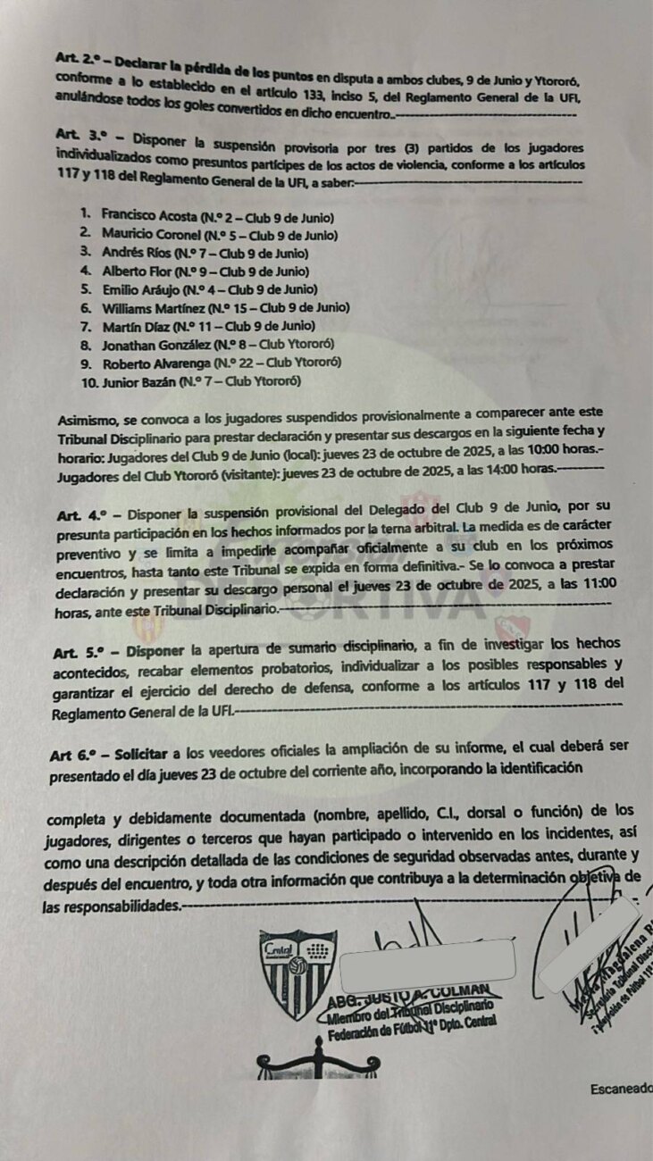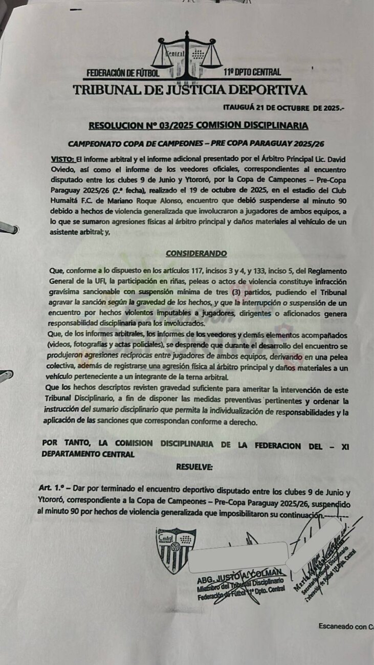 El Tribunal de Justicia Deportiva de la Federación de Central decidió aplicar un duro pero merecido castigo a los clubes 9 de Junio de Mariano Roque Alonso y el Ytororo FBC de San Antonio por el vergonzoso episodio que protagonizaron el domingo en cancha de Humaitá durante un partido correspondiente a la Copa de Campeones correspondiente a la Pre Copa Paraguay 2026.