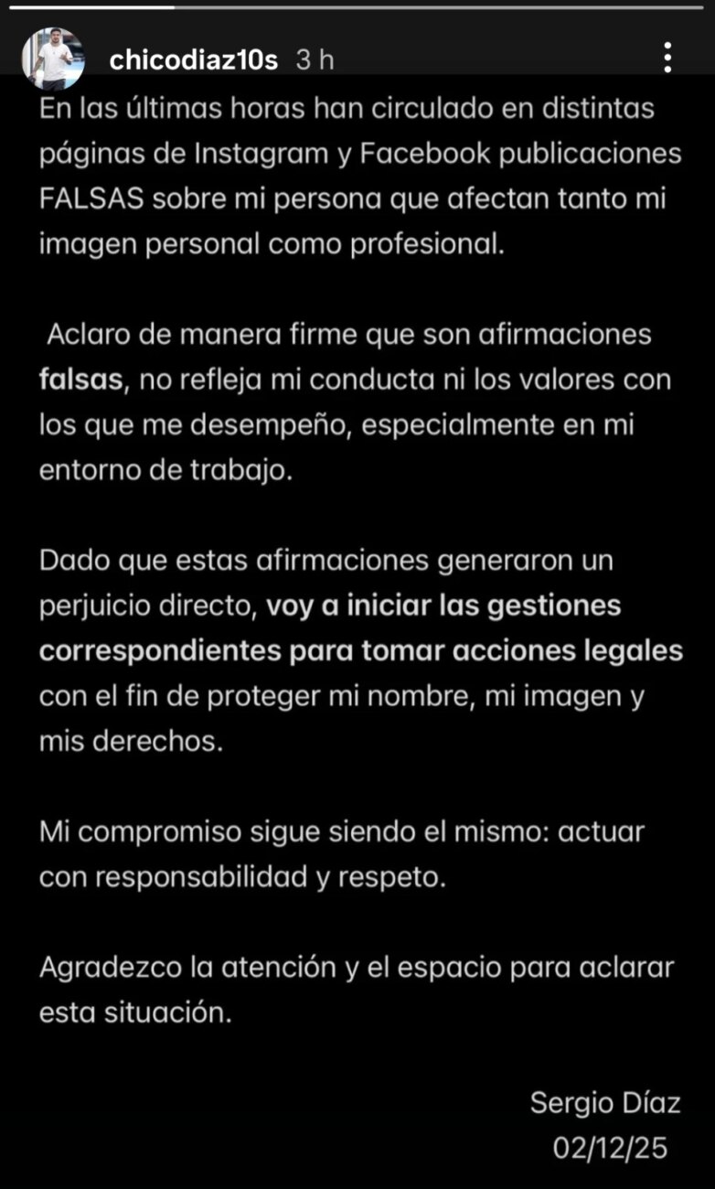 «Dado que estas afirmaciones generaron un perjuicio directo, voy a iniciar las gestiones correspondientes para tomar acciones legales con el fin de proteger mi nombre, mi imagen y mis derechos. Mi compromiso sigue siendo el mismo; actuar con responsabilidad y respeto», alegó.