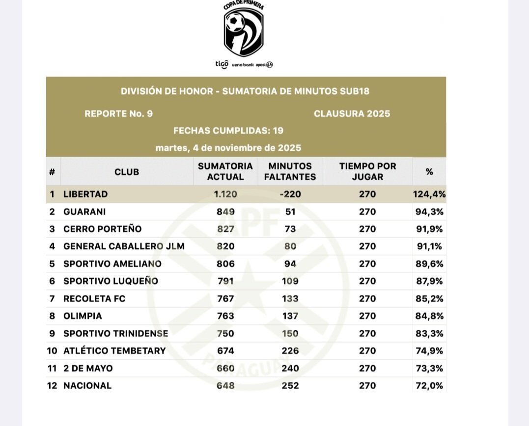 El otro que está muy cerca es Cerro Porteño, ya prácticamente lo hará seguramente en el próximo juego de Paraguay en el mundial sub 17. Mauricio de Carvalho jugó 67 minutos hoy ante Uzbekistán y a Cerro solo ya le faltaba 73. Con esto, solamente 6 minutos separan al Ciclón de cumplir la regla.