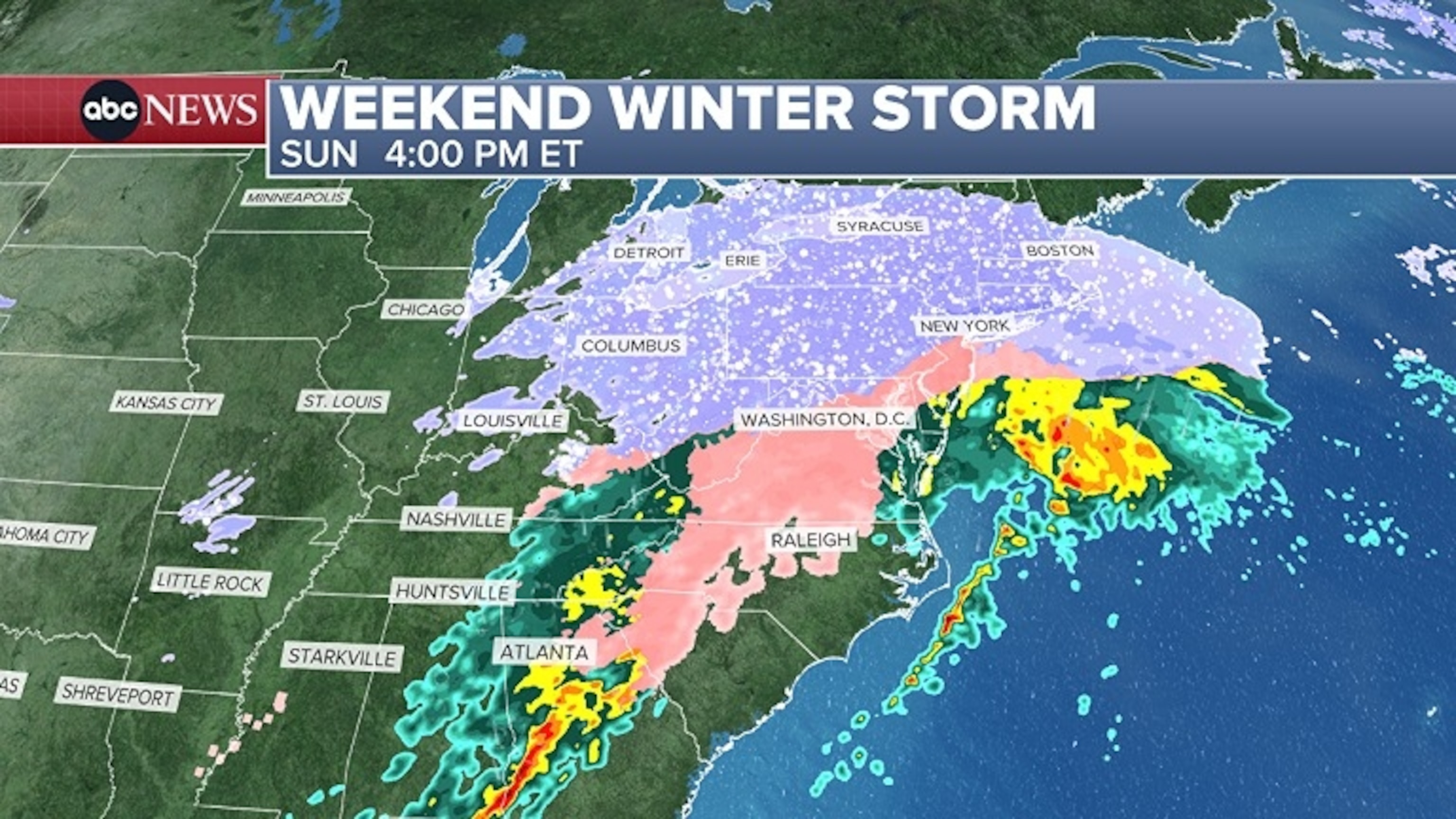 By 4 p.m. Sunday, snow will likely be falling from Louisville, Kentucky, to Chicago to New York City.
