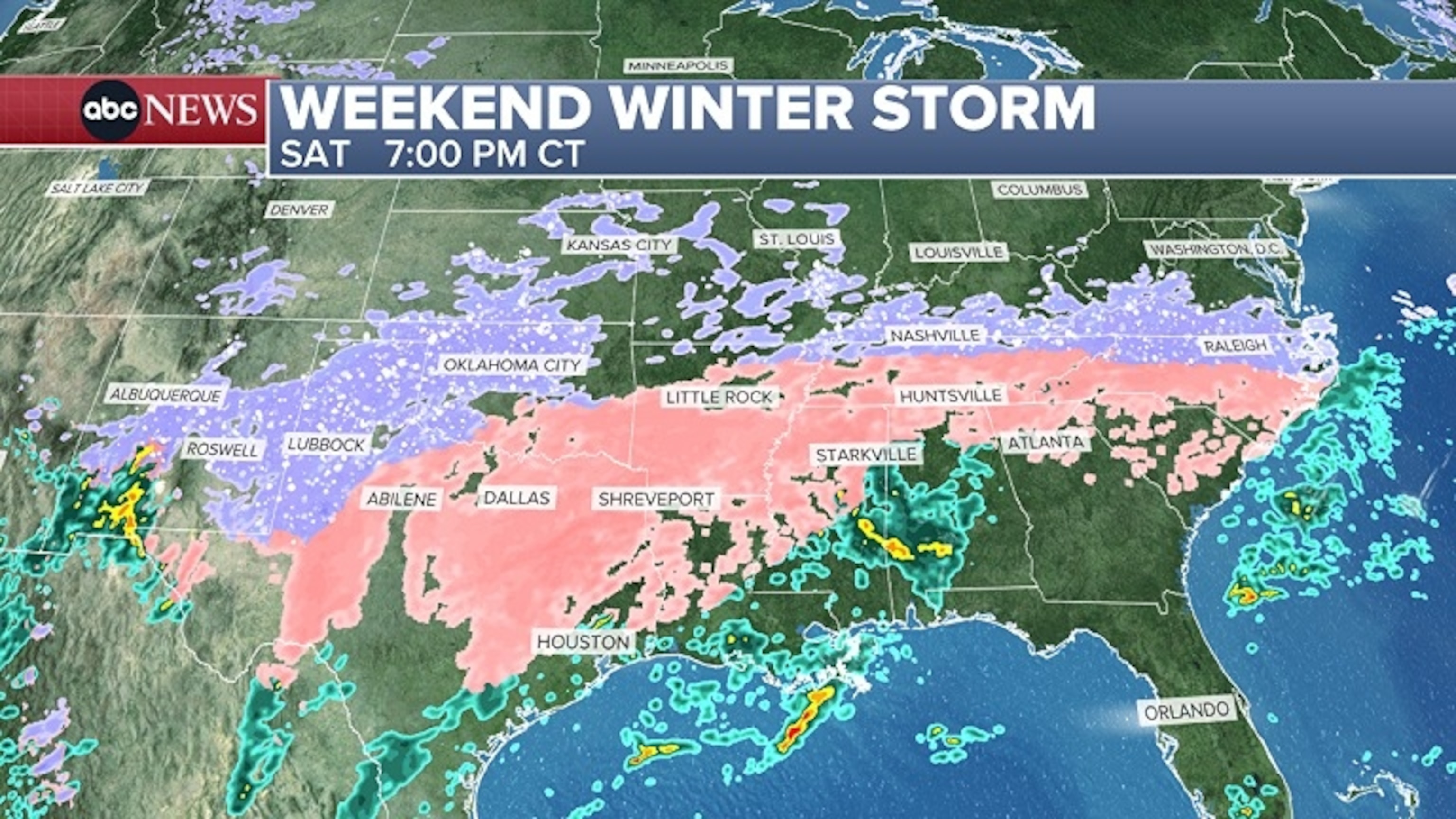 By Saturday evening, the snow and ice will stretch from New Mexico to the Carolinas.